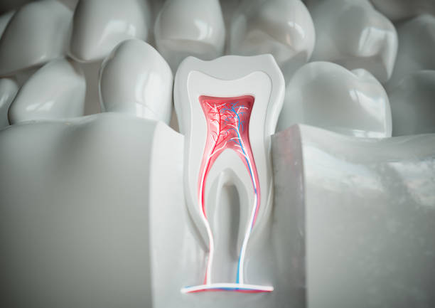 حالا میرسیم به بخش اصلی ماجرا، یعنی پالپ (Pulp). پالپ در مرکز دندان قرار دارد و شامل بافت نرم همبند، رگهای خونی، لنفاوی و اعصاب است. این همان بخشی است که در اصطلاح عامیانه به آن «عصب دندان» میگوییم. پالپ دندان در قسمت تاج دندان در محفظهای به نام اتاقک پالپ (Pulp Chamber) قرار دارد و در ریشههای دندان به صورت کانالهای باریکی به نام کانالهای ریشه (Root Canals) امتداد مییابد. این کانالها تا نوک ریشه، جایی که عروق و اعصاب وارد دندان میشوند، ادامه پیدا میکنند.